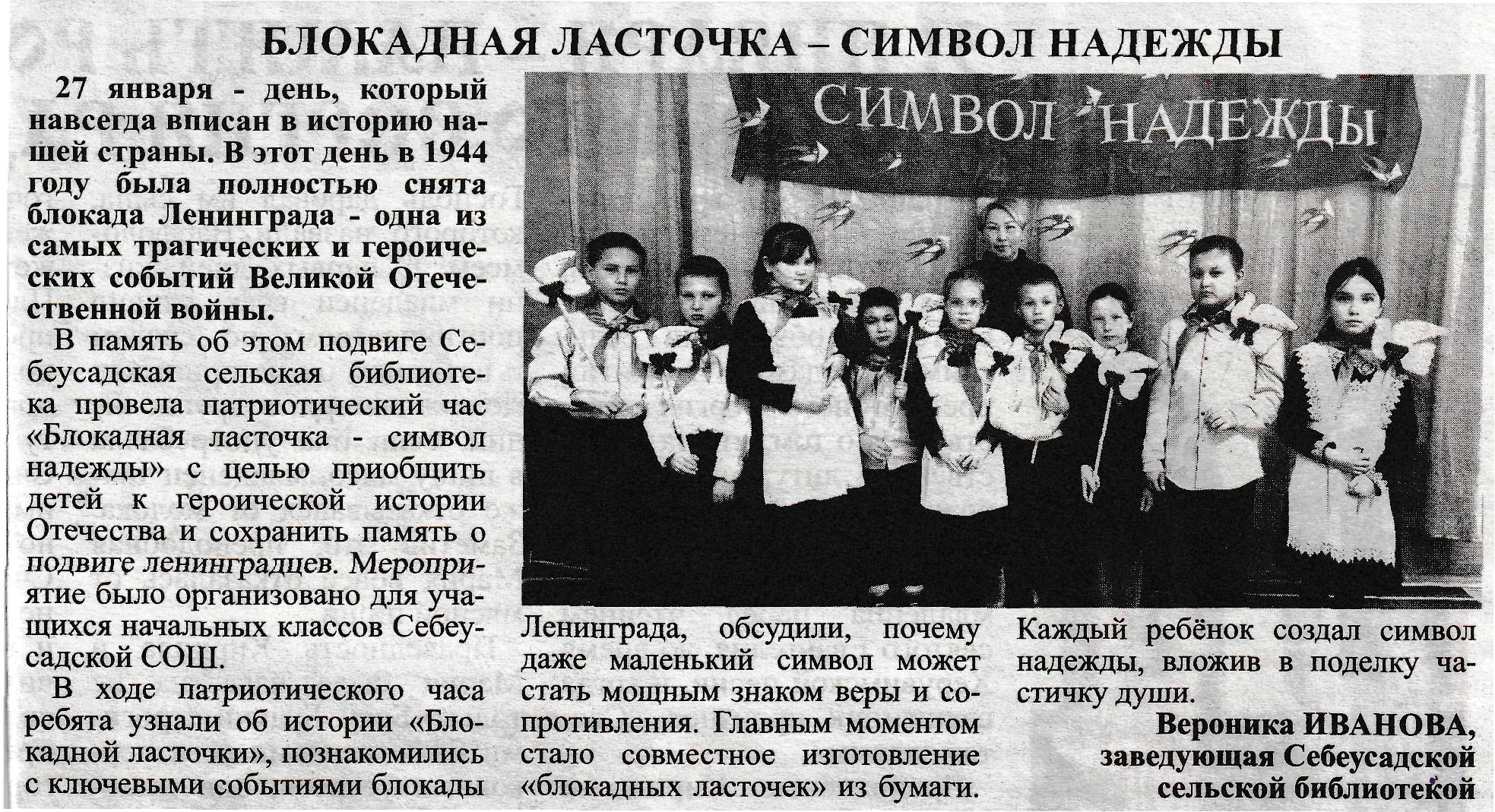 - Иванова В. Блокадная ласточка - символ надежды : [патриотический час в Себеусадской сельской библиотеке] / В. Иванова // Моркинская земля. - 2026. - 30 января. - С. 7